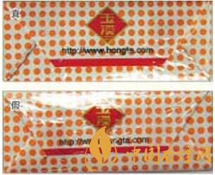 真煙所用的透明紙摩擦系數較低,透明度高,用手觸摸可感到其表面較光滑,紙質較薄;假煙所用的透明紙材質粗劣,摩擦系數較高,用手觸摸可感到較滯手,紙質較厚。