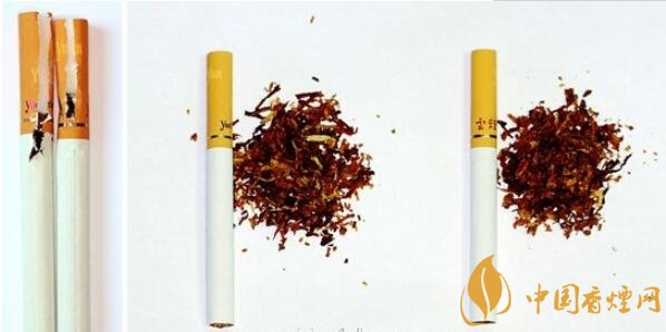 真煙煙支過濾嘴長度為25mm,煙絲切絲寬度均勻,摻配有少量膨脹梗絲和造紙法再造煙葉;假煙煙支過濾嘴較短長度為19mm,制絲工藝粗糙,大量梗絲未經(jīng)過膨脹處理,也未摻配造紙法再造煙葉,與真品特征存在明顯差異。