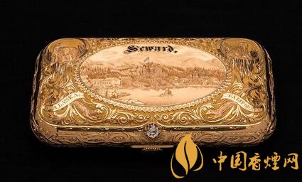 當時購買阿拉斯加后,留存了一大批資料,除了手寫的信件和官方文件外,還有報紙賬號,北極海岸地圖,還包括這個裝飾有標志性阿拉斯加場景的14K黃金雪茄盒。