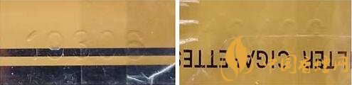 1.商標字體印刷。真品卷煙商標印刷采用“凹印”,兩種顏色交界邊緣呈現(xiàn)虛邊或鋸齒狀。假冒卷煙商標印刷一般采用“膠印”,兩種顏色交界邊緣比較清晰、光滑,無鋸齒狀。(圖1左真右假)