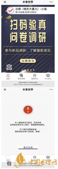 掃描二維碼后輸入煙盒內(nèi)6位驗(yàn)證碼,真煙顯示“第1次驗(yàn)真”;假煙顯示“本維碼被多次驗(yàn)證,存在異常”。