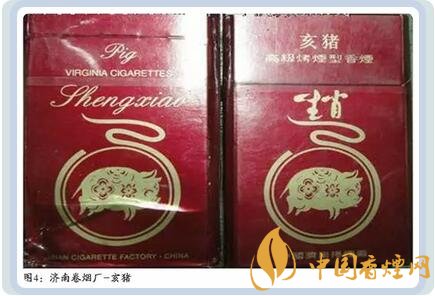 山東濟南卷煙廠曾出品過采用中國民間傳統(tǒng)的剪紙手法設(shè)計,底色為紅色的 “亥豬”煙標(biāo)。圖案上是一頭肥嘟嘟的花豬形象,其短小的四肢似乎支撐不了它的重量,兩只豎立的耳朵和張開的小嘴,表明它正在尋找食物,看上去十分溫馴、可愛。