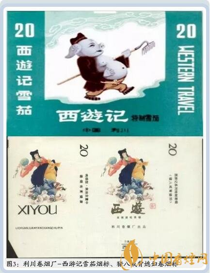 湖北利川卷煙廠出品的“西游記”套標(biāo)中有一枚煙標(biāo)以人格化的豬-豬八戒為主圖,該煙標(biāo)上的豬八戒憨態(tài)可掬,惟妙惟肖,還有另一款豬八戒背媳婦,圖中豬八戒背著一名女子騰云駕霧,略偏頭向后嘴巴微張似正與女子攀談,女子手持蒲扇,一幅神態(tài)自若的樣子。