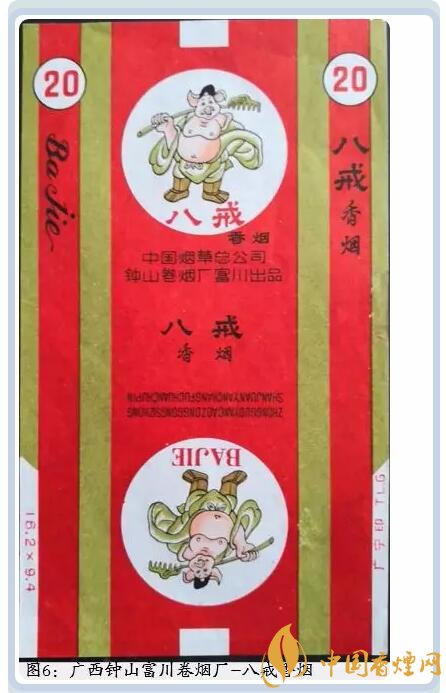 廣西鐘山富川卷煙廠生產(chǎn)過一款八戒香煙,圖案是豬八戒扛著釘耙開懷大笑,其腳下還標(biāo)有八戒二字。