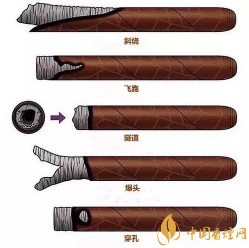 我們抽雪茄的時候經(jīng)常會發(fā)現(xiàn)雪茄燃燒出現(xiàn)各種問題,這種問題我們可以稱作是雪茄的不完美燃燒,雪茄的不完美燃燒是日常抽雪茄經(jīng)常會遇到的。這張圖就展示了我們抽雪茄中經(jīng)常會遇到的問題。