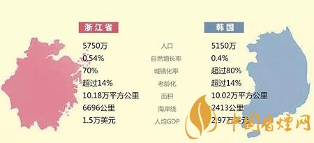 從人口來看,2018年韓國人口總數(shù)約為5150萬,自然人口增長率為0.4%,城鎮(zhèn)化率超過80%。浙江全省常住人口約為5750萬,自然增長率為0.54%,城鎮(zhèn)化率接近70%。從人口規(guī)模、人口增長率來看,浙江略高于韓國,從城鎮(zhèn)化水平來看,又略低于韓國。這些要素的“差不多”,使得韓國、浙江卷煙市場容量、城鄉(xiāng)結構、業(yè)態(tài)類型的比較具備了參考性。