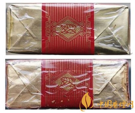真品卷煙:1.透明紙燙封收縮均勻、自然,有烙鐵痕跡。2.商標(biāo)紙拐角折疊空隙較大。