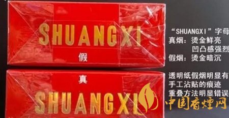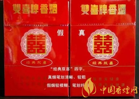 2、看小盒包裝的商標印刷工藝:尤其是“經(jīng)典雙喜”這4個字,真煙筆劃清晰,字體要粗一些;而假煙的筆劃模糊,字體纖細。