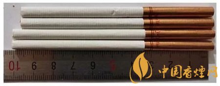 真品卷煙:煙支長度為100mm,濾嘴處有四排激光預(yù)打孔,打孔透氣度好。卷煙紙顏色白,手摸煙支飽滿緊實(shí),搭扣處結(jié)合完美。煙絲呈現(xiàn)絲條狀,色澤基本一致。