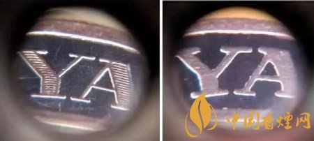 真品卷煙金腰帶頂部YUNYAN拼音,筆畫(huà)內(nèi)有橫線(xiàn)條痕跡。該款假冒卷煙字母筆畫(huà)內(nèi)無(wú)橫線(xiàn)條痕跡。圖4左真右假(左真右假)