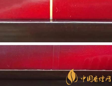 真品卷煙商標(biāo)紙邊緣裁切干凈、光清,無(wú)毛邊。該款假冒卷煙商標(biāo)紙邊緣裁切粗糙,毛邊多。(上真下假)