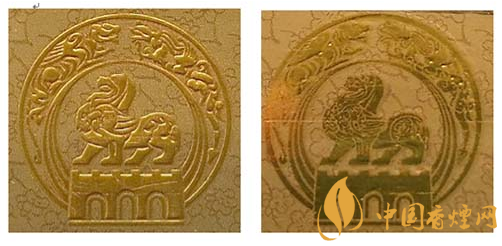 假冒卷煙:該款假冒卷煙南京市徽?qǐng)D案,無凹凸感,色彩暗淡,圖案模糊。(左真右假)