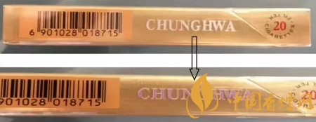 “中華”(雙中支)產(chǎn)品小盒采用硬盒(雙包)翻蓋的包裝形式,煙支規(guī)格為89mm(長(zhǎng))*20mm(圓周)。小盒側(cè)面英文字母“CHUNGHWA”采用熒光變色防偽油墨;在紫外光照下,白色“CHUNGHWA”會(huì)變成紫紅色,一段時(shí)間后紫紅色褪去。