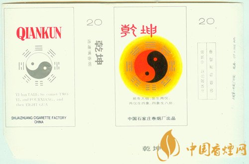 由于“乾”“坤”兩卦在八卦中占有特別重要的地位,因而河北石家莊卷煙廠曾于上世紀(jì)80年代出品了“乾坤”煙標(biāo),其主、副版于太極八卦圖下方,還分別用中英文印有出自《易傳·系辭上傳》的“易有太極、是生兩儀。兩儀生四象、四象生八卦”。