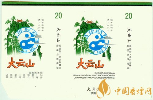 “太極八卦”在為道教所利用的同時(shí),道家還認(rèn)為“太極八卦”有神通廣大、鎮(zhèn)懾邪惡的功效。因而以道教名山為主題的煙標(biāo)就少不了“太極八卦圖”。 上世紀(jì)80年代,湖南龍山卷煙廠出品的“大云山”煙標(biāo),主、副版不僅突出描繪了青翠欲滴的大云山峰,而且凸顯出“太極八卦圖”,同時(shí)在其右上方還印有“欲求前程景 請(qǐng)上大云山”字樣。