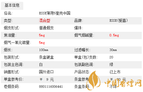 (注:08年四月份左右愛喜推出新款香煙,長度和粗度均和普通香煙一樣,成分和口味均和和原來細長型愛喜并無分別。新款愛喜的煙盒和老款也有所區(qū)別,和上面的圖有一點不一樣,在新款愛喜彈劾“ESSE”的商標(biāo)左面會多出“Menthol”的字樣。)