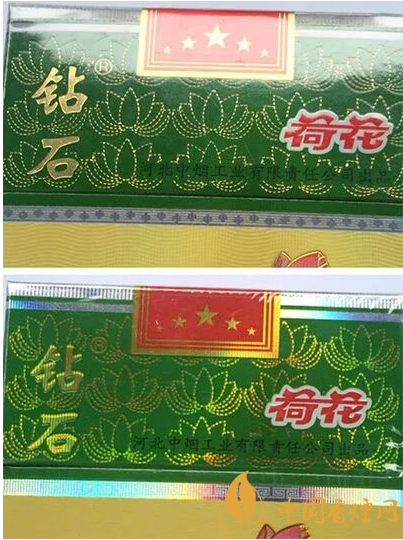 假煙正面的“鉆石”兩字的燙金呈豎條紋狀,“荷花”兩字的邊緣為光滑的白色印刷。