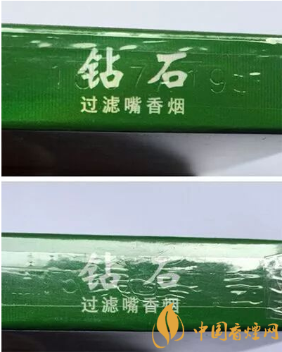 真品卷煙正面的“鉆石”兩字燙金光滑、平整,“荷花”兩字的邊緣為豎條紋狀的白色印刷;