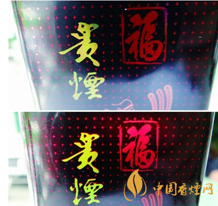 商標(biāo)紙印刷工藝差異對比:真品小盒正面商標(biāo)紙“貴煙”燙金由無數(shù)的網(wǎng)格狀組合而成;假煙小盒正面商標(biāo)紙“貴煙”字體普通仿造印刷而成,與真品商標(biāo)紙印刷工藝存在明顯差異。