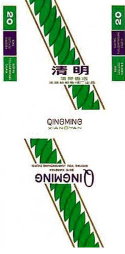 中國第一個以“清明”為牌名的煙標(biāo),是由山東益都(今青州)卷煙廠出品的“清明”煙標(biāo)。白底色的畫面上醒目的“清明”兩字,底下是拼音字母“QINGMING”。綠色的枝葉簡潔而素雅,賦予了“萬物生長此時,皆清潔而明凈”的含義。